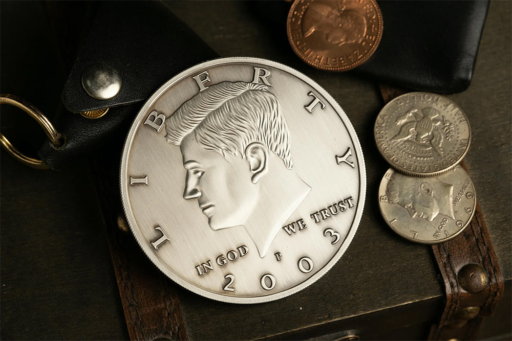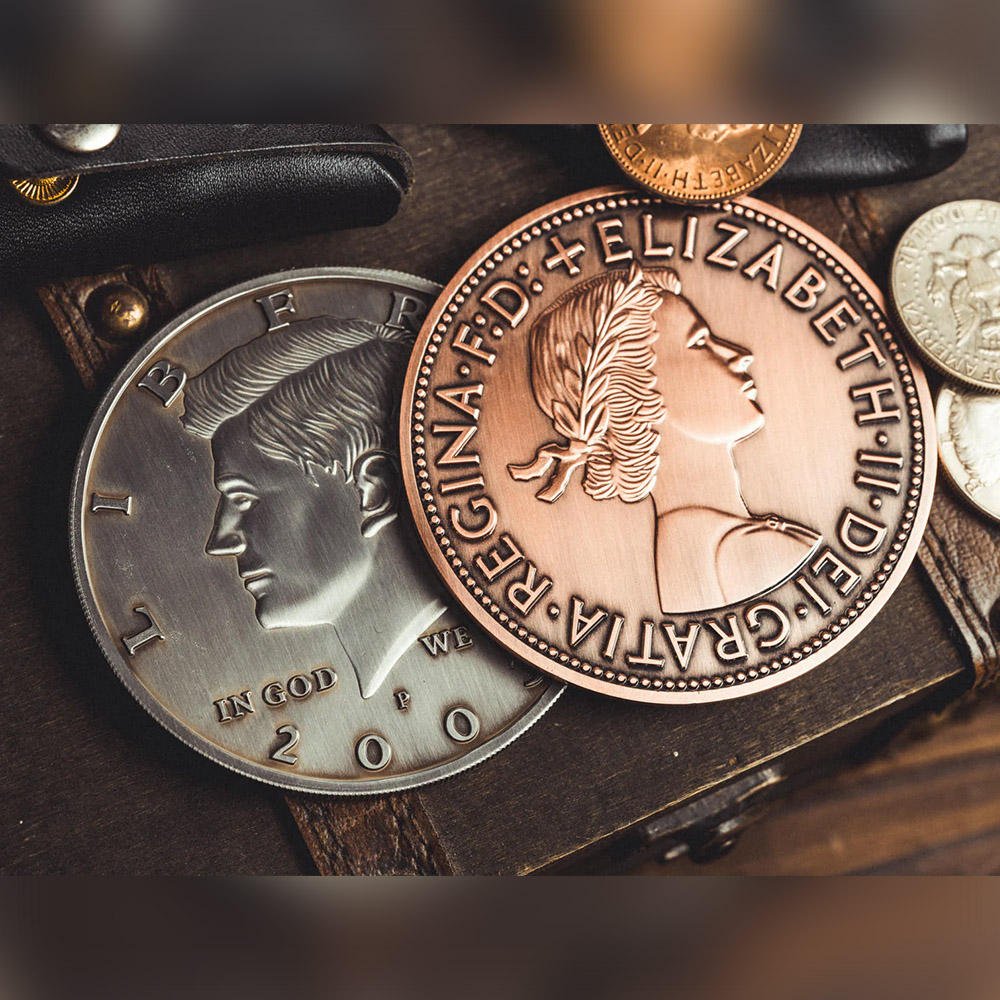 The Bacon Jumbo Coin is a premium prop available in American Kennedy Half Dollar and English Penny designs.
