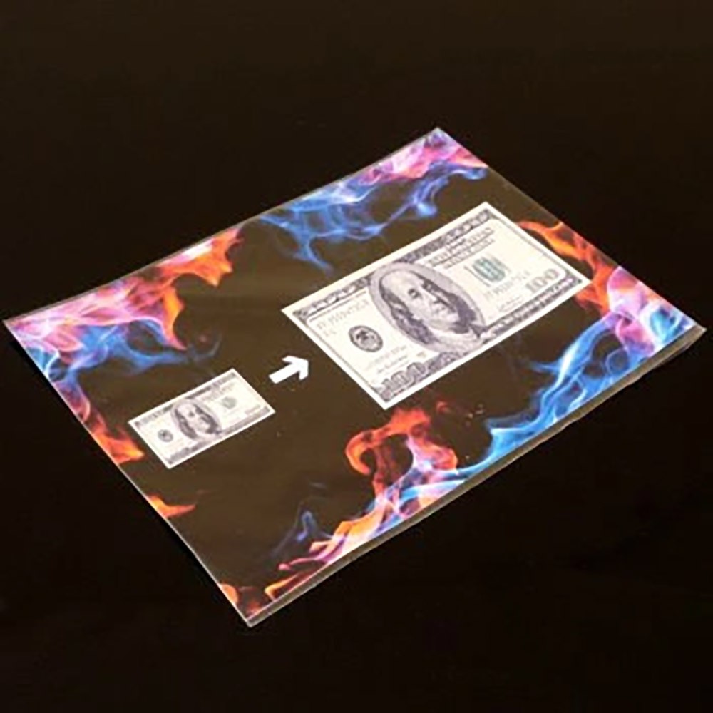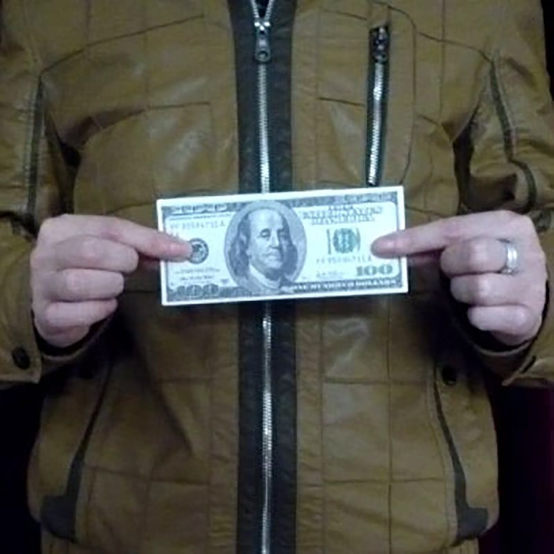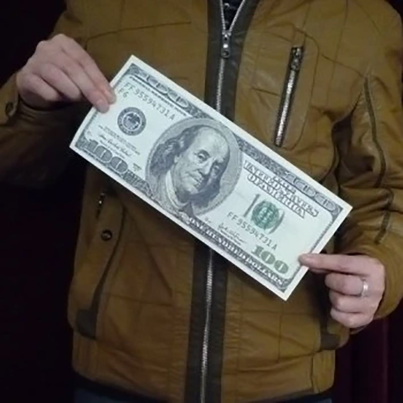 The magician displays a small $100 bill. With a magical gesture, the bill visibly grows larger and larger—until it transforms into an oversized $100 bill for a powerful and humorous climax.