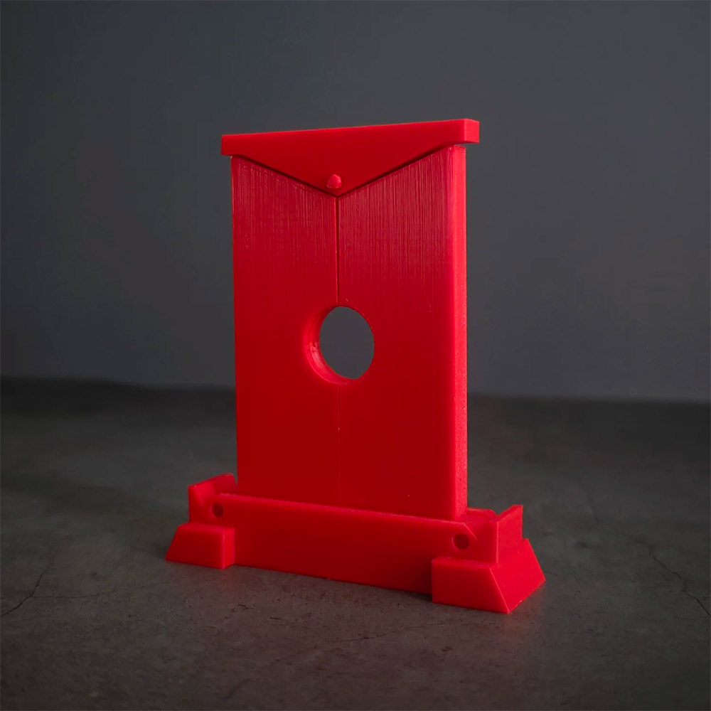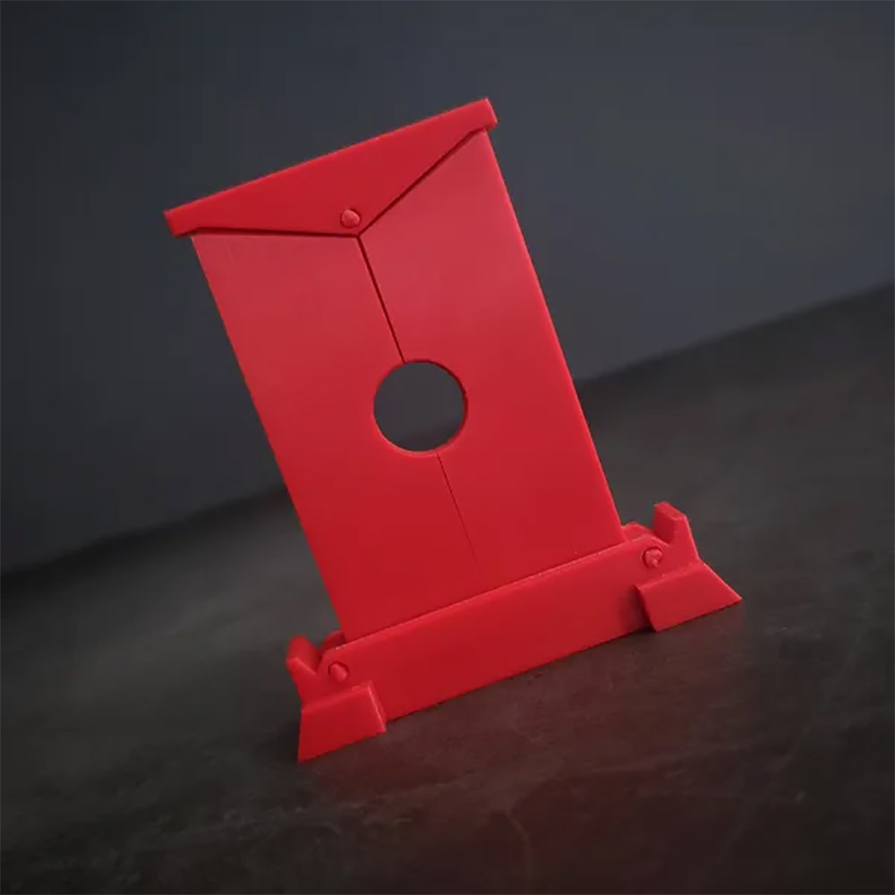 You show a plastic frame with a removable slotted blade. The frame opens at the bottom with a hinge, allowing you to prove it’s empty. You insert the solid plastic board into the frame and display both sides clearly.