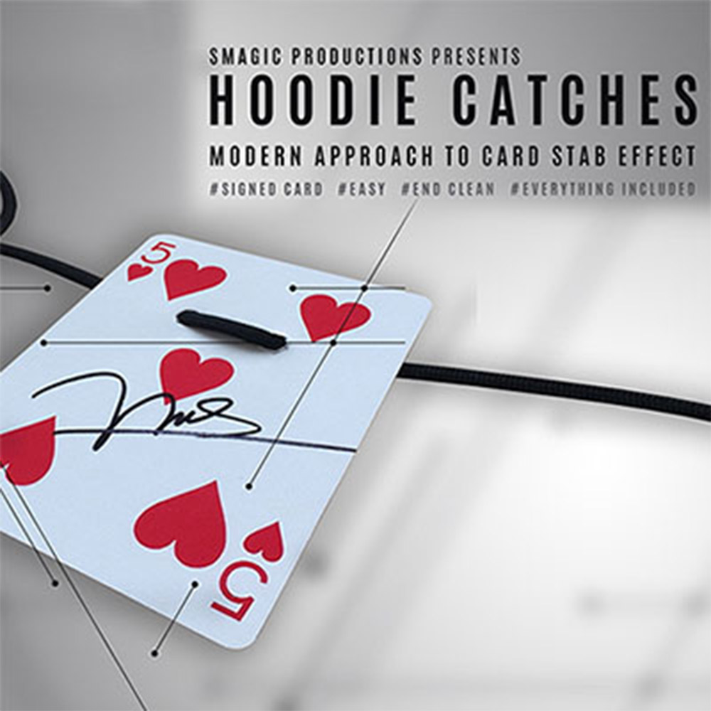 Hoodie Catches is the modern approach to the Card Stab effect, using an everyday hoodie. The spectator signs a card, which subsequently gets lost inside the deck. You now wrap a string from your favorite hoodie – the modern version of a sword – around the deck. Holding the hoodie string, you now pull it apart to create a beautiful card blossom effect in the air with only one signed card stabbed through its back! That's slick! It's so practical and so strong that the effect never fails to excite audiences. Imagine a finale for your card act that packs small and plays big for an entire roomful of people.