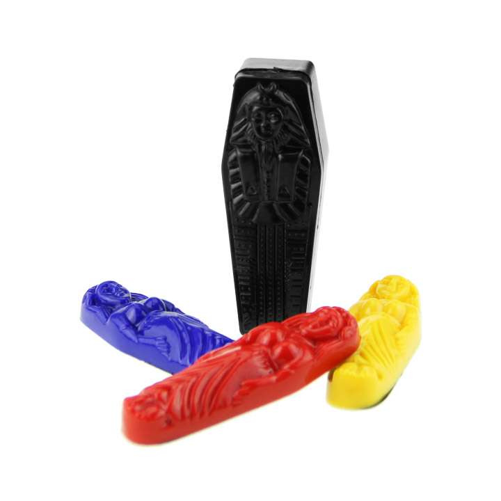 3 Mummy's and a Coffin are shown A spectator is asked to examine the coffin and put any mummy (no force) in the coffin while the magicians back is turned, he is then asked to hide the other 2 mummy's when the magician turns round he can tell which mummy is in the coffin.