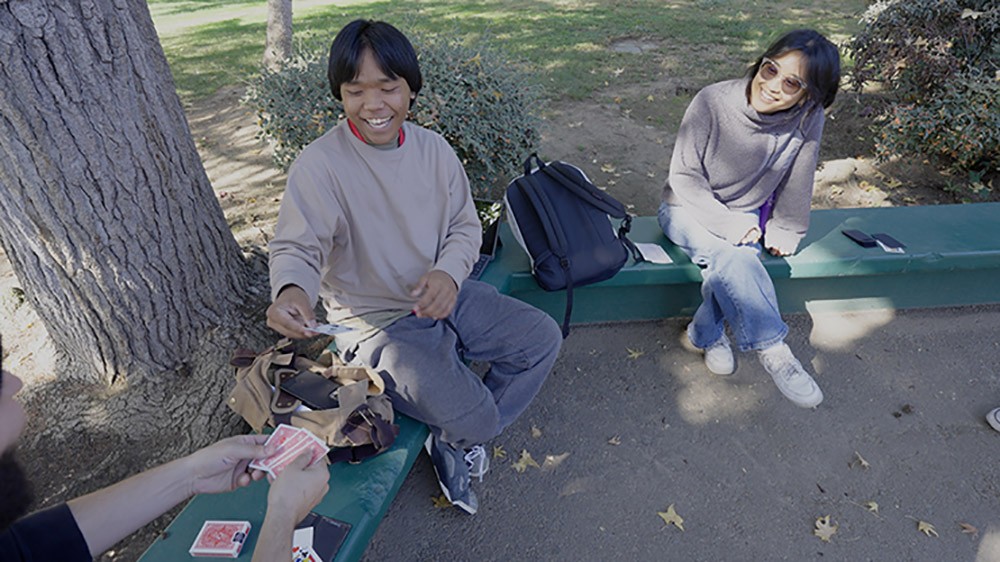 Both spectators hold their packets far apart, isolating the cards and eliminating any possibility of trickery… or so they think.