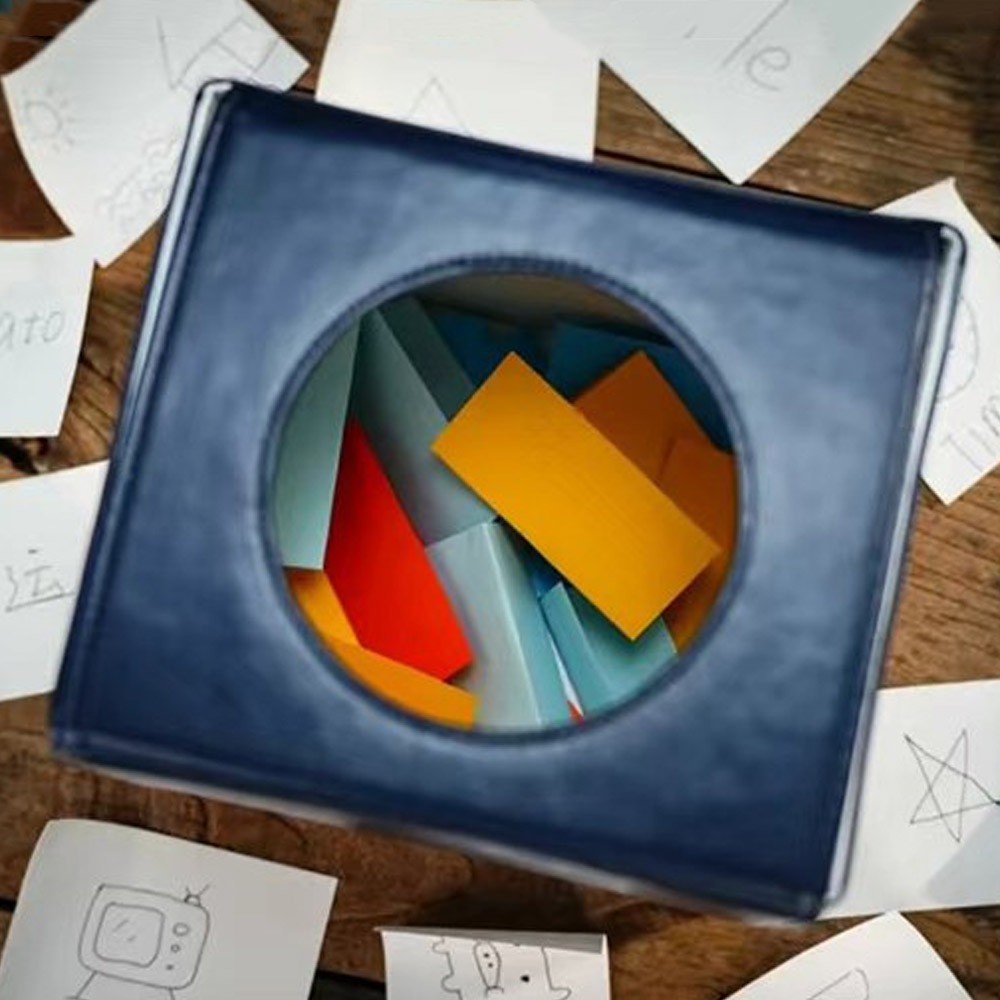 You fold a flat-packed board into a box. Audience members randomly write words on slips of paper, fold them, and drop them inside. A volunteer is then asked to draw four specific colored notes: Yellow, Purple, Blue, and Red.