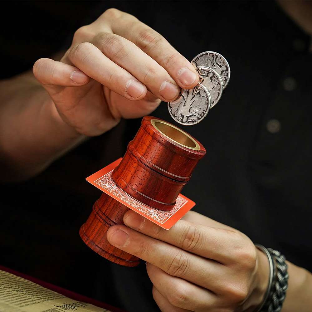 The Coin Penetration Tube is a classic coin magic prop. It consists of two metal or wooden cylinders that can be snapped together and split apart, with a playing card or metal plate in between them. The magic happens when a coin is placed in one end of the tube and passes through to the other end. The beauty of this prop is that it does not require any complicated sleights or techniques.